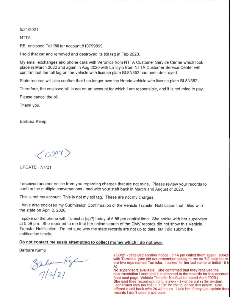 I have spent literally hours on the phone either waiting or talking to NTTA agents Veronica (March 2020), LaToyia (Aug 2020), Tamisha (7/1/21), and a second Tamisha (7/30/21) regarding the destruction of my original toll tag after I sold the car, and regarding the bills for a toll incurred after I sold the car. None of them would transfer me to a supervisor when I requested that.