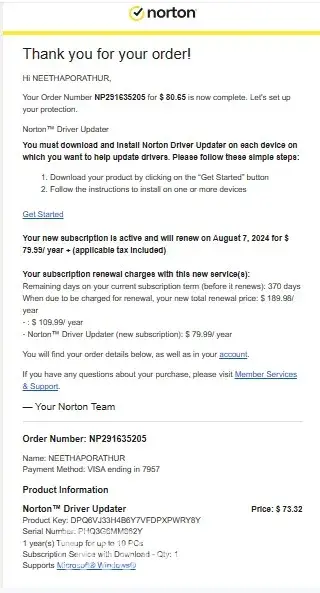 for $ 299.99 against Order ID [protected] for Renewal Norton 360 Full Protection.