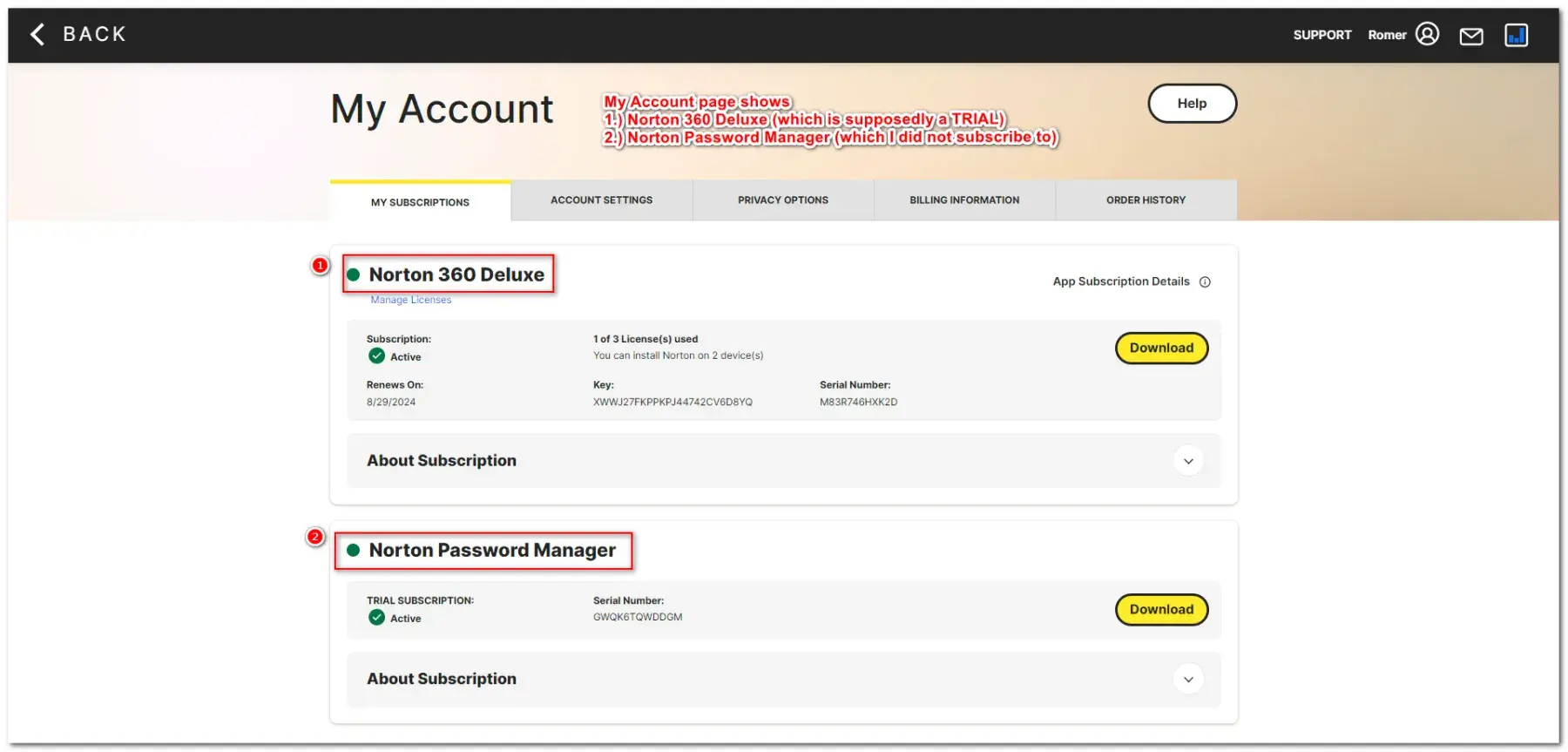 I signed in to my Norton account My Account page shows Norton 360 Deluxe (which was supposedly a 14-day Trial) as well as Norton Password Manager (which I did not subscribe to). See screenshot 1.