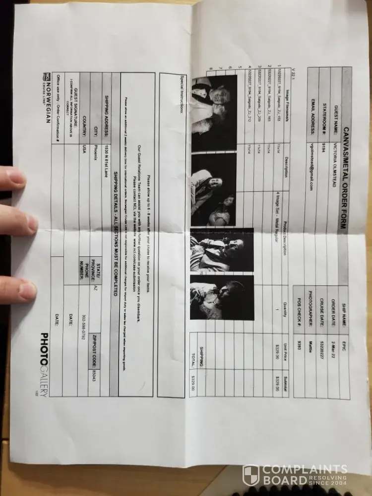 My daughter, Victoria Olmstead, had a vow renewal ceremony on Feb 28th of this year. She ordered a 4 picture metallic artwork at that time and, of course, paid for it. I am attaching the all documentation that shows her purchase. She was told at the time it would be delivered within 6 to 8 weeks. We are now at week 14 and no one has provided her any information about the status of this item. I don't understand why your company is so lax about servicing past cruise issues and the fact that you cannot talk to a person in Guest Services after you have cruised to address open items is terrible customer service.