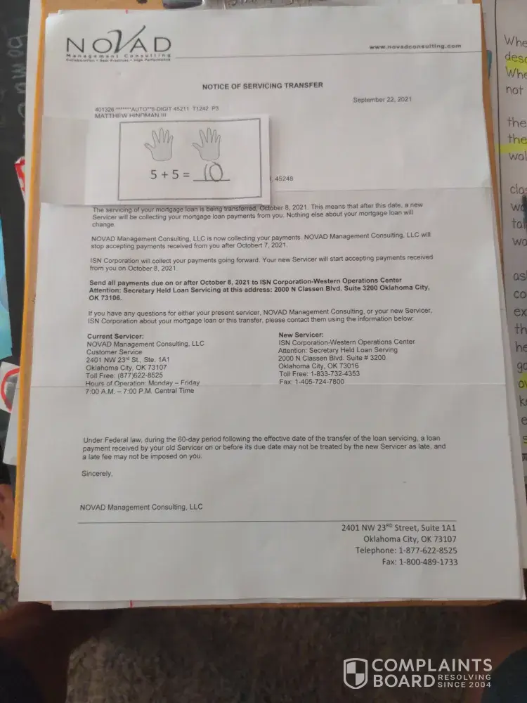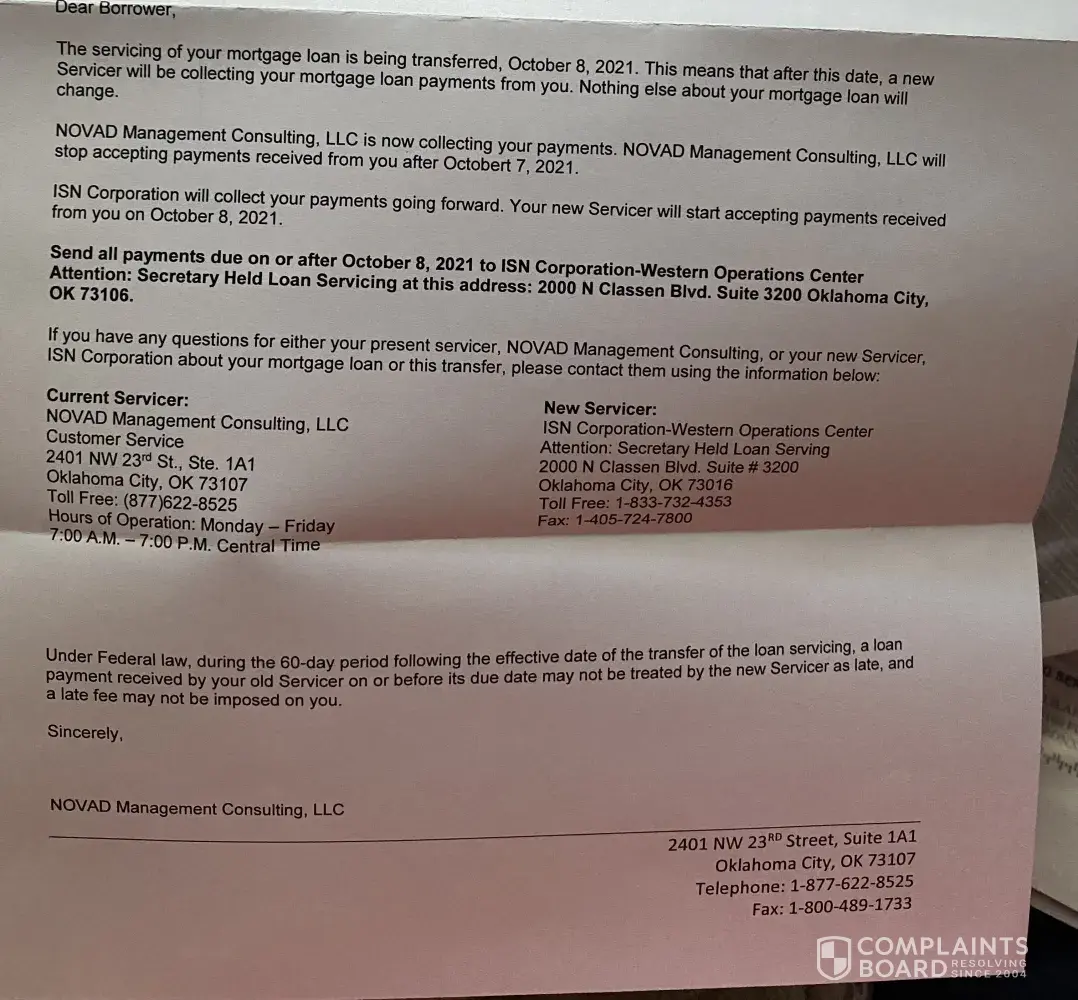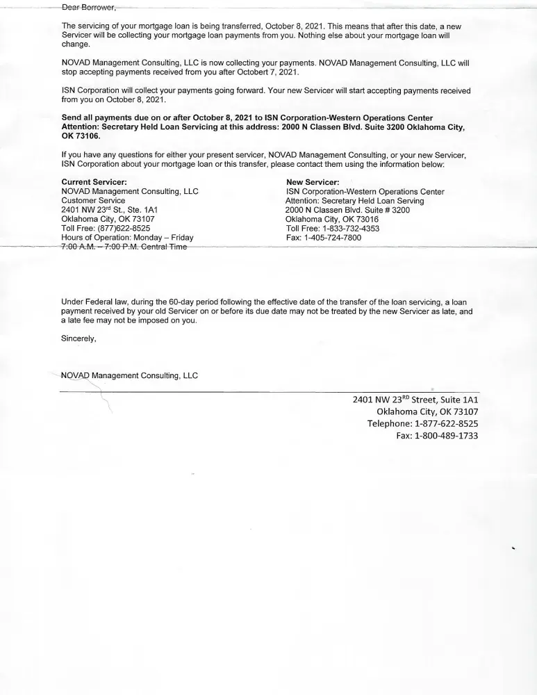 I received a letter dated September 22, 2021 stating my mortgage loan is being transferred from Novad Management Consulting LLC to ISN Corporation - Western Operations Center October 8, 2021. Send payments to 2000 N Classen Blvd, Suite 3200 Oklahoma City, oK 73106. My loan is not/has never been serviced by Novad Management Consulting, LLC. Novad toll free...