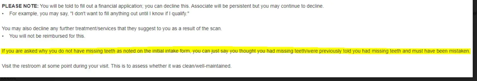 Someone is not going to think they have 5 or more missing teeth and are mistaken. I bet Nuvia will not refund the $89 deposit since you lied to them to be seen. I wonder what percentage of the $89 secretshopper.com gets?