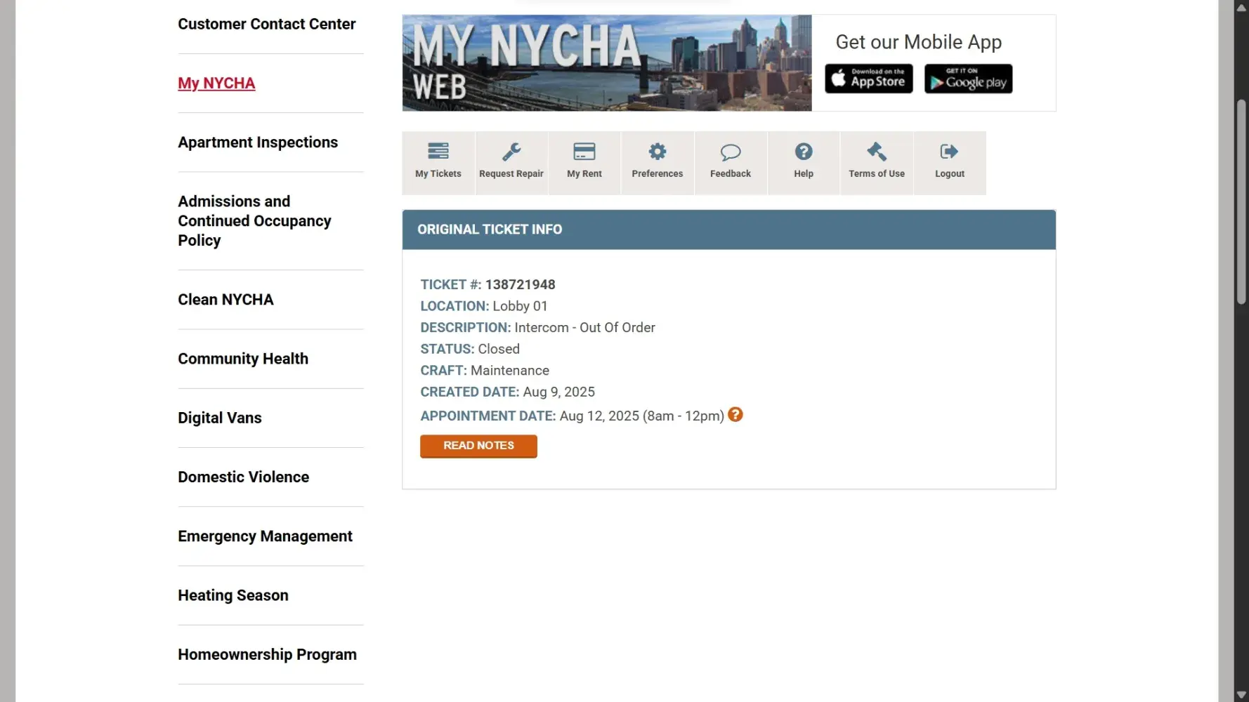 The intercom has been out of order for months. I have submitted a maintenance request on 8/9/25, but the work ticket [protected]) was closed without any reason and NYCHA has not repaired the intercom. I struggle with health issues and need to have most of my food and groceries delivered. It's a problem when the lobby door is locked and I'm unable to buzz the...