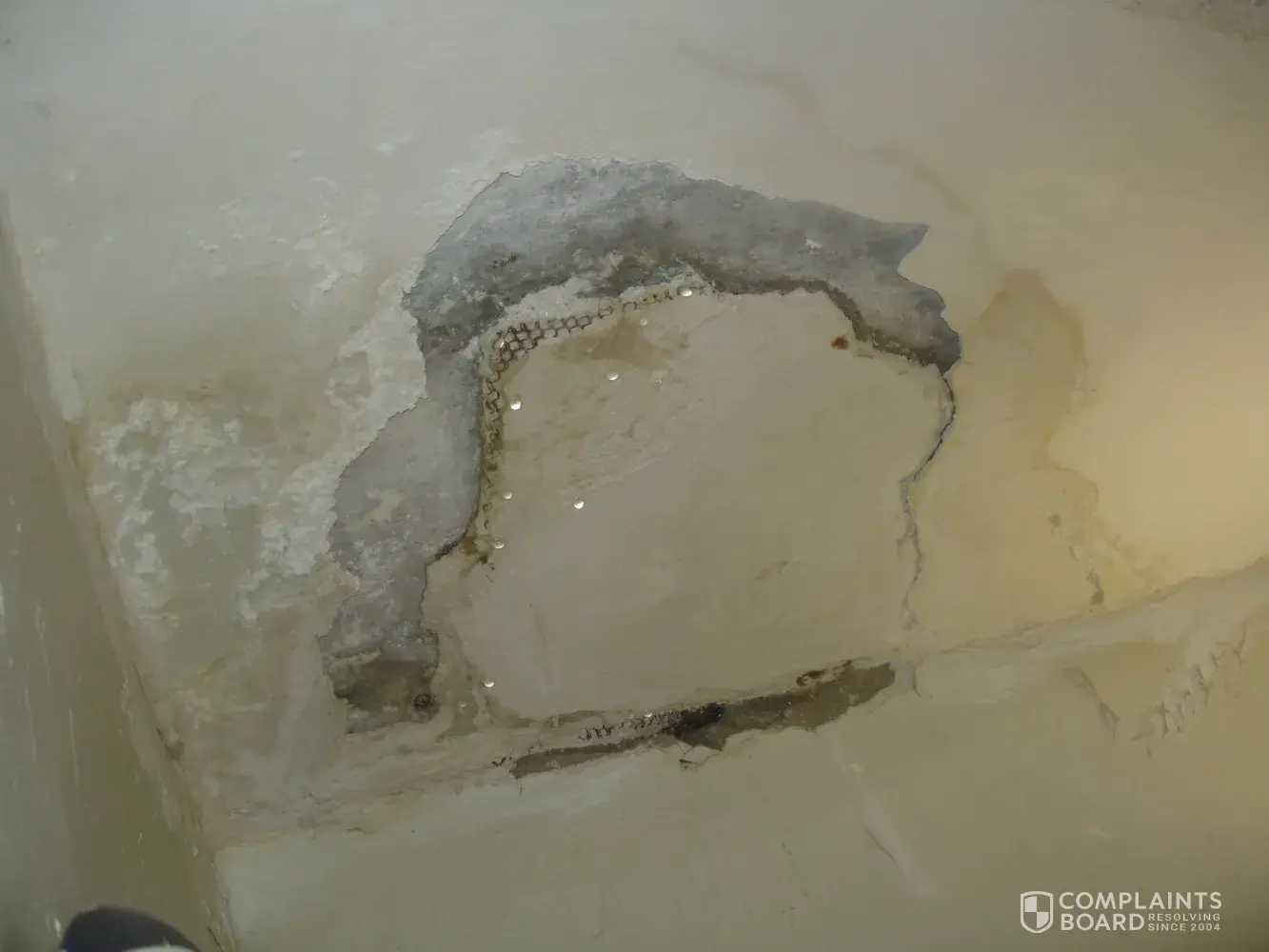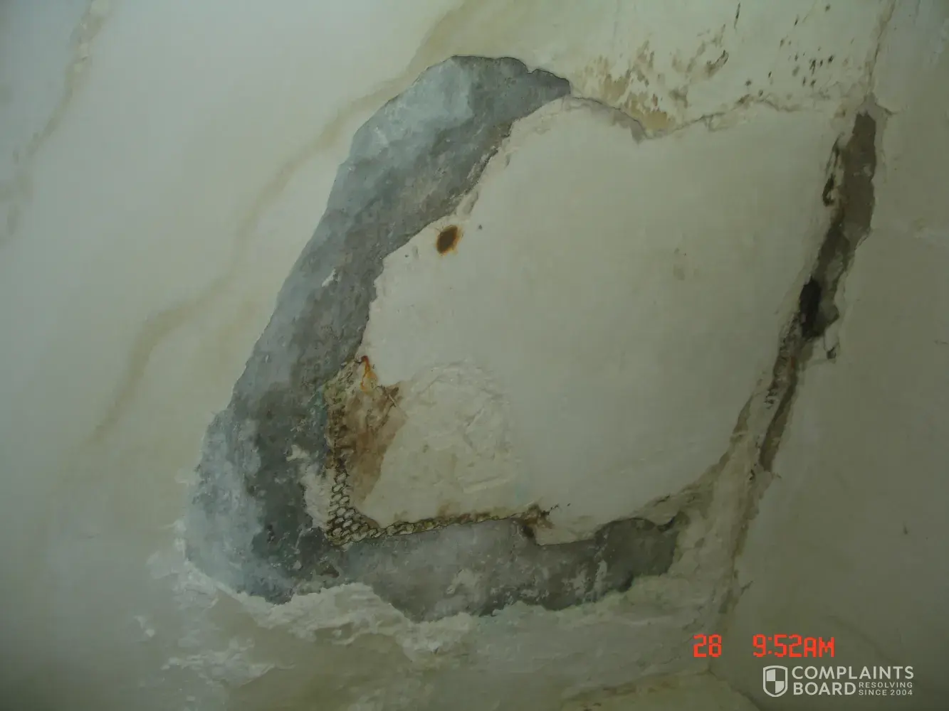 3 - july 6 2010 arrived - the ceiling was so messed up by then, that plasterer jerry johnson said " I dont know what i'm doing yet" and took a look at the ceiling and says "he can't do anything about it. " he stated you need a to set an appointment for brick layer. We've waited nearly a year and nothings been done!