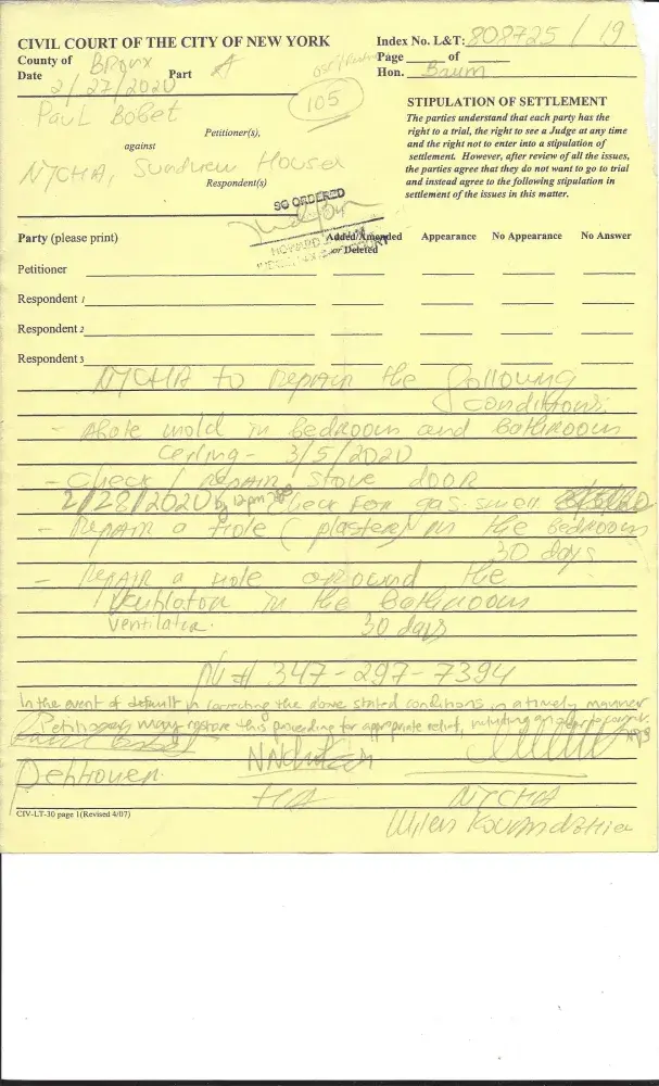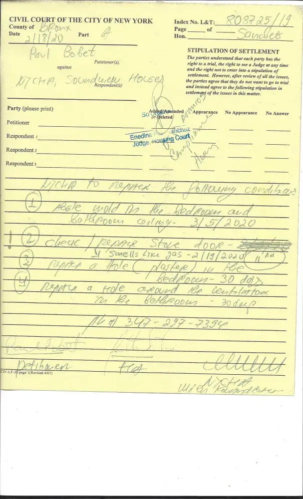 My name is Tony Bobet. I resided at 1710 Seward Avenue, Apartment#5-g, Bronx, NY 10473. I am filling an complaint at New York City Housing Authority that no heat in the apartment. They were heat in the apartment for a short awhile. Here is the tickets# [protected] from April 10, 2020. And, on April 11, 2020. I call for heat and hot water. And, I have the stove...