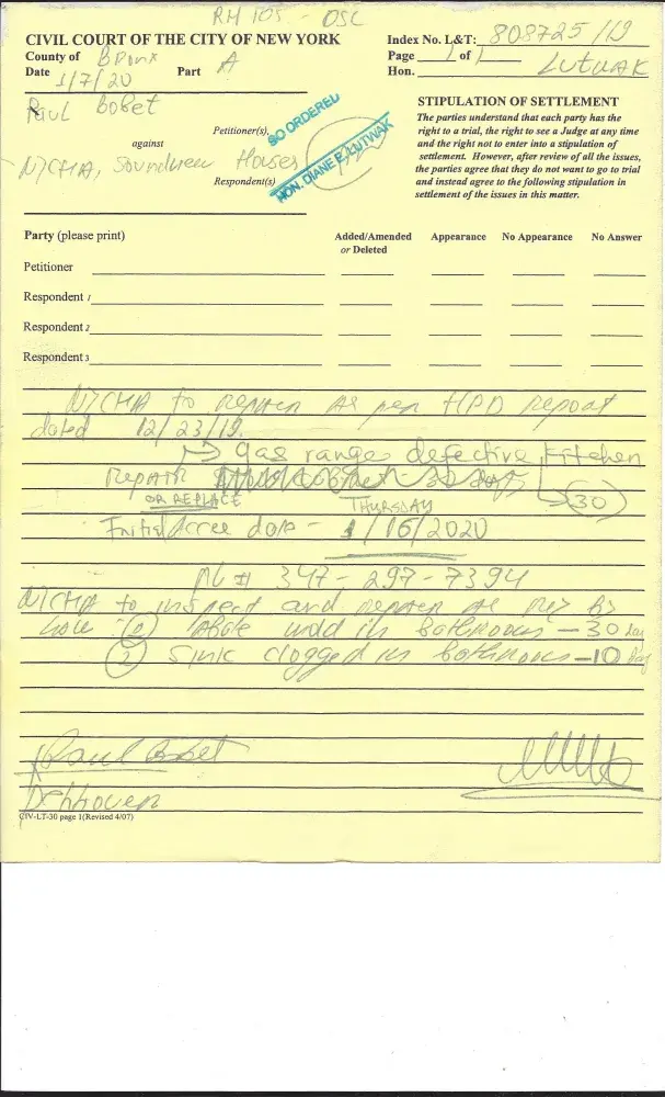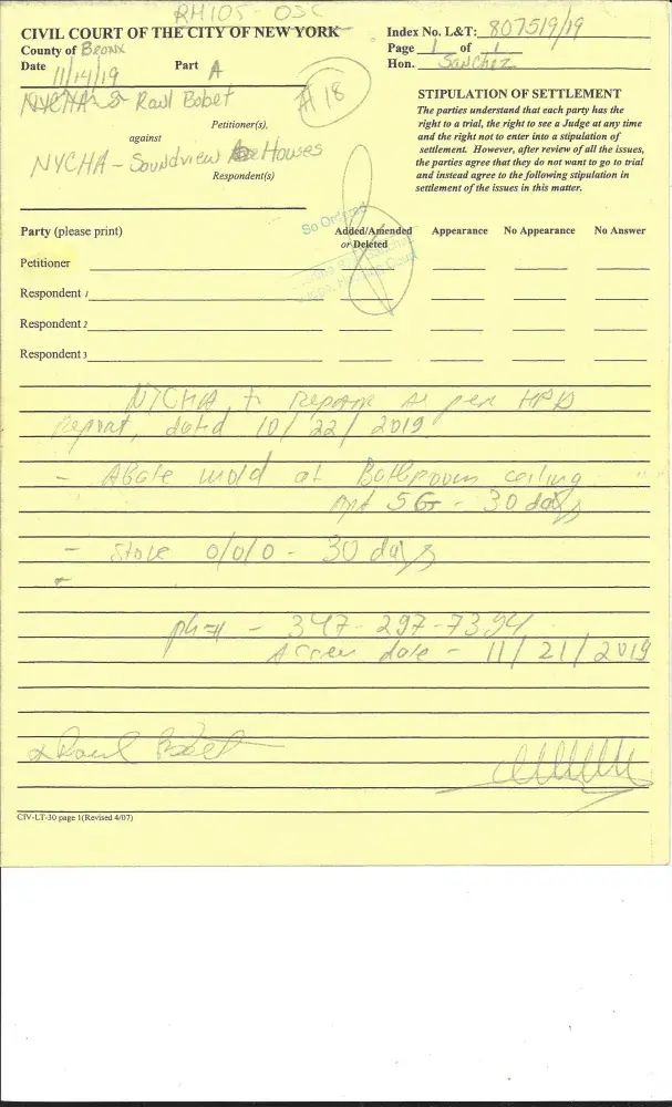 Hello, My name is Tony Bobet. I resided at 1710 Seward Avenue, Bronx, New York City, 10473, Apartment# 5-G. My brother, Raul Bobet, that he resided with me. He went to court to file an complaint because they ( New York City Housing Authority ) are doing any repair. So, my brother went to court to order the repairs. Additional, of that the judge tell the...