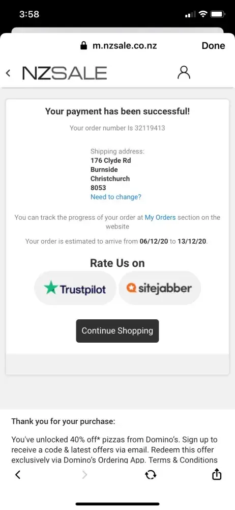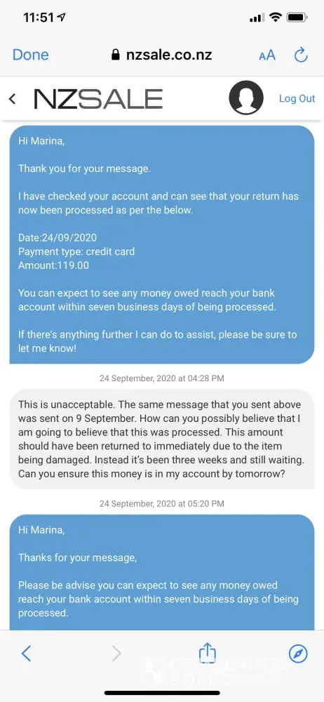 I purchased a product off NZ Sale on 22nd November 2020. I took a screenshot of the purchase order number [protected]), however I did not receive any confirmation emails from NZ Sale. The money came out of our credit card on Monday 23rd November for the purchase. It said on their web site that I could track my order on their website however, when I went to log in again it came back with not a valid password. When I pressed reset my password button I did not receive any email from NZSale with a link to reset my password to my email address. On sending a query on their contact us page on their website (no other emails or phone number provided) an automated message comes back saying that I can see the response by logging into my profile on their website but I can't log in as it is saying I don't have a valid password. I have messaged them twice via their website contact us page and received the same message twice. I now do not have any idea if I will receive the goods or not. Goods are estimated to arrive from 6 Dec to 13 Dec however, I hold little hope and feel that this is a scam web site.