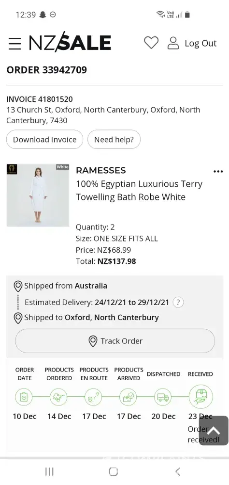 At the beginning of December 2021, I ordered two towel robes from NZSale at the total value of $137. I recieved no tracking information on the email address I provided (and have since provided again). I went back on the website and checked my order. Its tracking came up with "no information available".