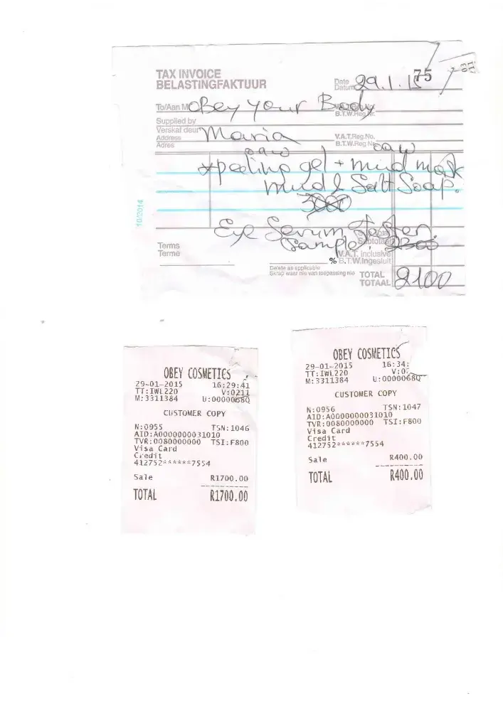 On the 29 of January 2015 at Menlyn shopping Centre a very nice Isreali girl grap my arm and se put some of the product on my arm, and then she said I must take a seat, put some eye serum on my eye. The results were amazing! But then she told me if I am going the take a eye cerum, cleansing soap, mud mask and peeling gel it wil only cost me R3000.00. I told that I dont have that much money the she came down to R2100. I bought it. Today I am back in offce and I googled Obey your body, suprisingly the product is much cheaper! I have the receipt that she wrote me. That are really daylight robbery!