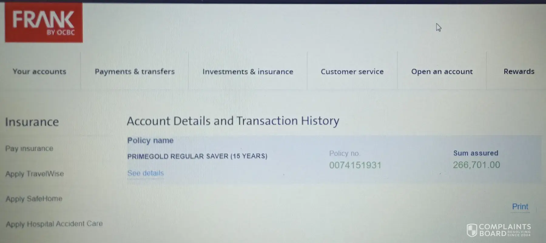 Dear OCBC Compliance officer, C/c: To whom it may concern. I happened to randomly checked my bank account through iBanking whether if my hardwork salary had been credited. I suddenly found out that there's a transaction/policy being purchased without my acknowledge/knowledge at all, or what's it all about on this policy. Name of assured: LIM KIAN...