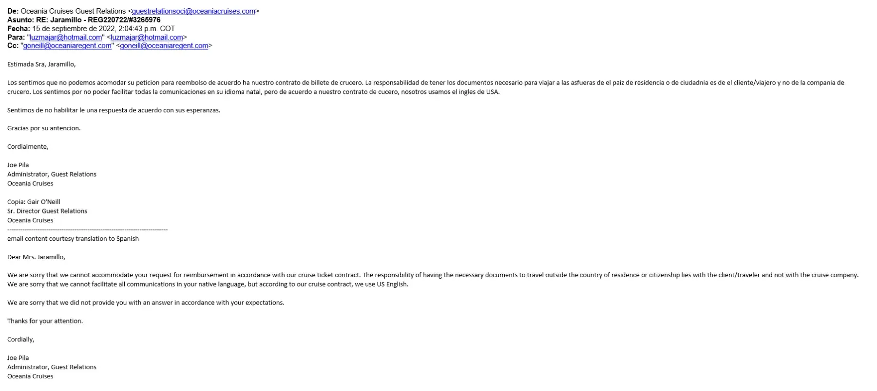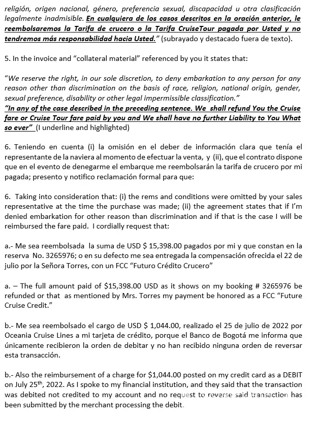 As the cruise was purchased in Colombia, and the sales representative does have a local number in my country I expected the disclosure of the terms and conditions prior to my purchase and in the same language all the negotiation was conducted.