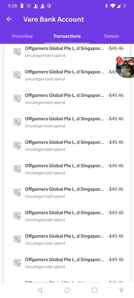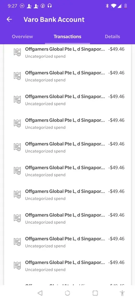 My name is Joseph Baker. I have never heard of Offgamers Global and I have never used their services or bought whatever it is they sell, but I was charged $49.46 to my Varo card ending in 4418 20 times consecutively on November 29, 2020. These were not made by me and they were not authorized by me either. The total of the charges is $989.20. I need this money back immediately. I have attempted to contact this company to no avail and notified Varo Bank but neither have yielded results.