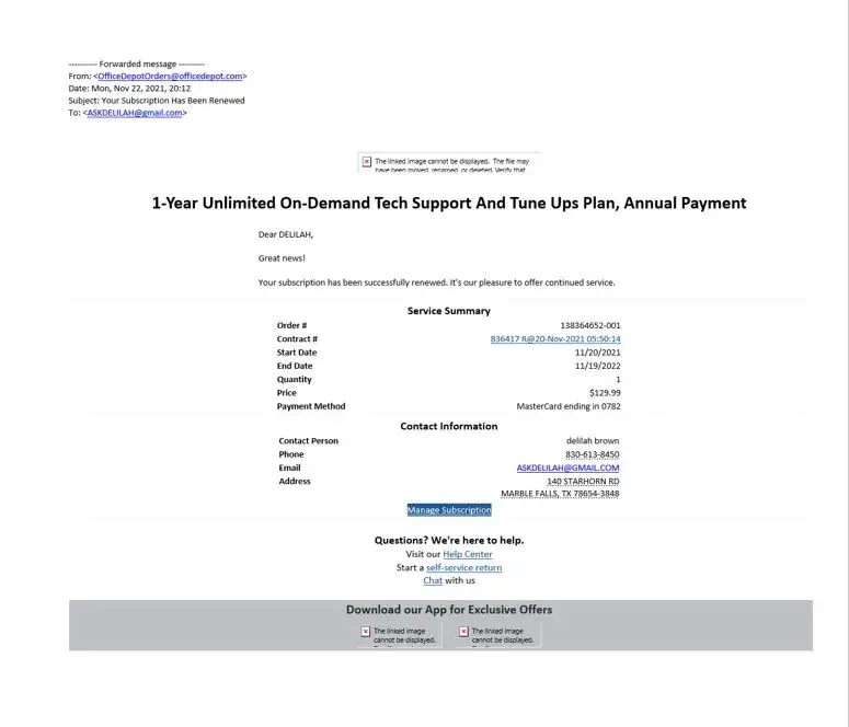 $129.99. The order number that was given to me was [protected]. They showed it under Cust ID: [protected].The reference number that was provided to me was [protected]. When I called to check, the person indicated there was no record. The Office Depot representative said "I have checked with the refund has been already processed for the tech subscription’s."