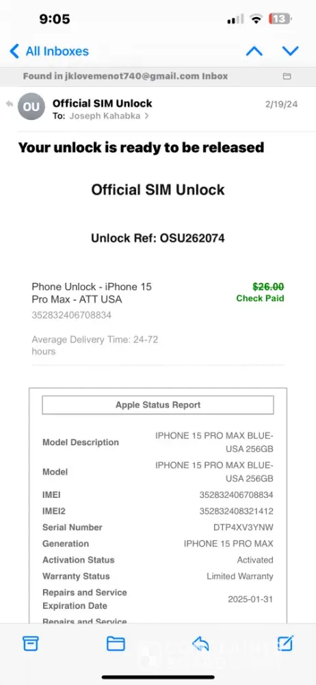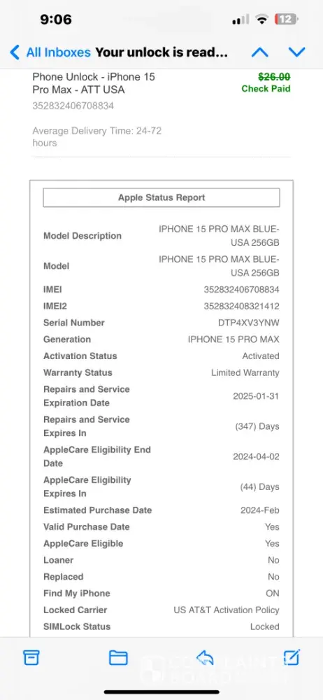 On 2/18/24 I submitted a request to http://www.officialsimunlock.com/ to get my iPhone 15 Pro Max Carrier unlocked. The fee for the Unlock eligibility check was $26.00. The way they advertised I thought that that’s all it was gonna cost a little behold they wanted more money. So on 2/19/24 I paid $79.00 for the official Sim Unlock order. As advertised...