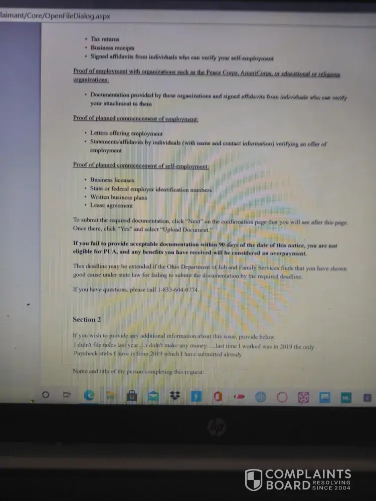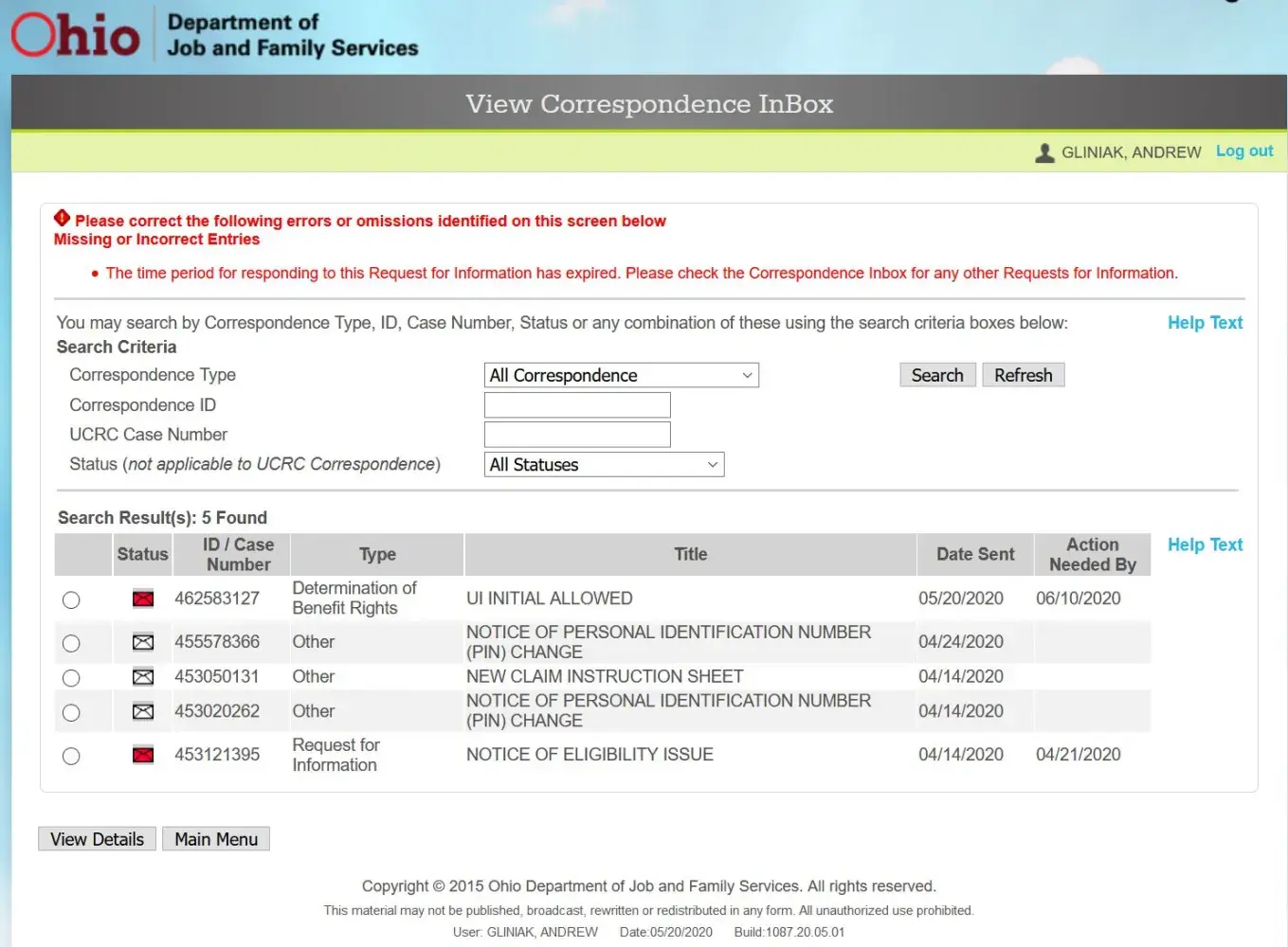 It is impossible to get in contact with Ohio Unemployment Services. I filed on 4/13/20. I left work at Cabela's, Avon, Ohio on 3/18/20. My claim number is CA30-[protected]. The day after I filed my claim I saw that I had a correspondence from the Unemployment Service. However I could not view it. Everytime I tried I got an error message and I tried many many times, over weeks. I have called so many times. I have waited over hours many times. Once I just left the phone on speaker and decide to wait as long as it takes and I did get through. But the people said I had to talk to another department, OK. But then I just got put in the hold cycle again and gave up after a long time.