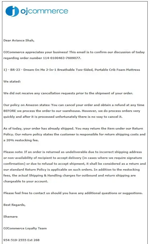 Today (8/13/2018), I got an alert from Amazon that the order for the crib mattress was shipped out and they gave a FedEx tracking number. I immediately called Amazon's customer service who informed me that they received my cancellation request but the note from the seller OJ Commerce indicated that it could not be cancelled. Really? After 2hrs of placing my order which was still in a "pending" state? The rep from Amazon was very friendly and helpful and asked me to hold on the line while she connected with the merchant. When she came back on the phone, she informed me that she had a rep from OJ Commerce on the line to assist me. The rep then proceeded to advise me that as per their policy, she could not cancel the order and that they never received my request to cancel the order so the mattress was shipped out and would arrive on 8/16/2018. I asked her how come they could receive my order so quickly but give me such a hassle to cancel after 2hrs of placing the order. She answered with "I understand that you are frustrated but that is only because I am telling you things you do not want to hear." Was I hearing her correct?