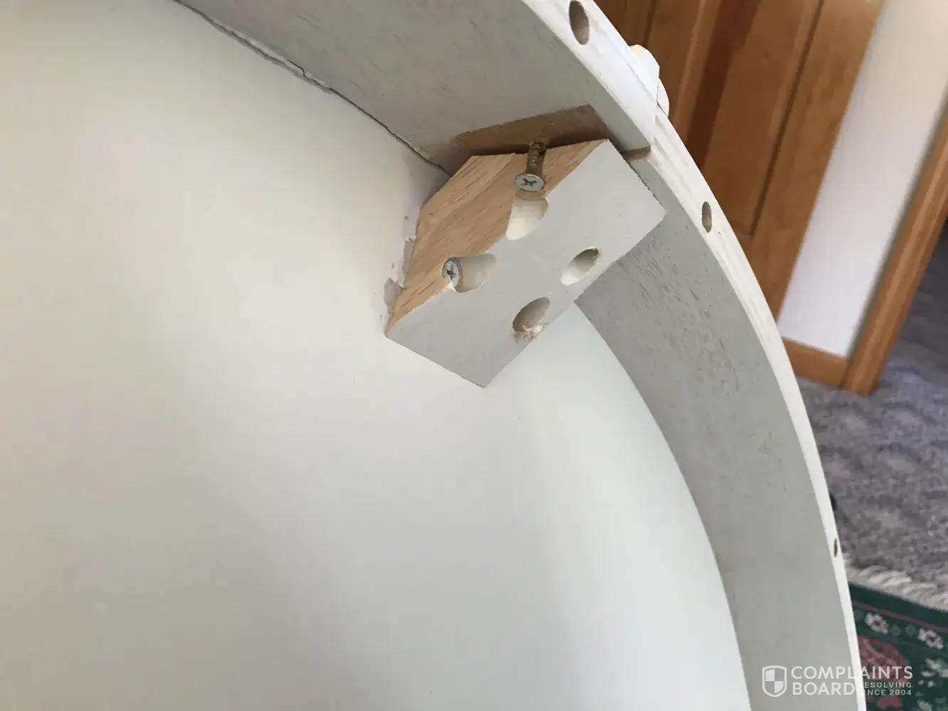 The circular band fastened to the underneath side of the table top is broken in two ways. I am worried that it may make the table structurally unsound. I am attaching photos. The piece placed on the outside of the band where two pieces meet is cracked from top to bottom and all the way through. The wedge piece connecting table top and the circular band under the table top has the side broken off exposing the screws. The piece that was broken off is in the third picture. The whole table top/w underneath band probably needs to be replaced.