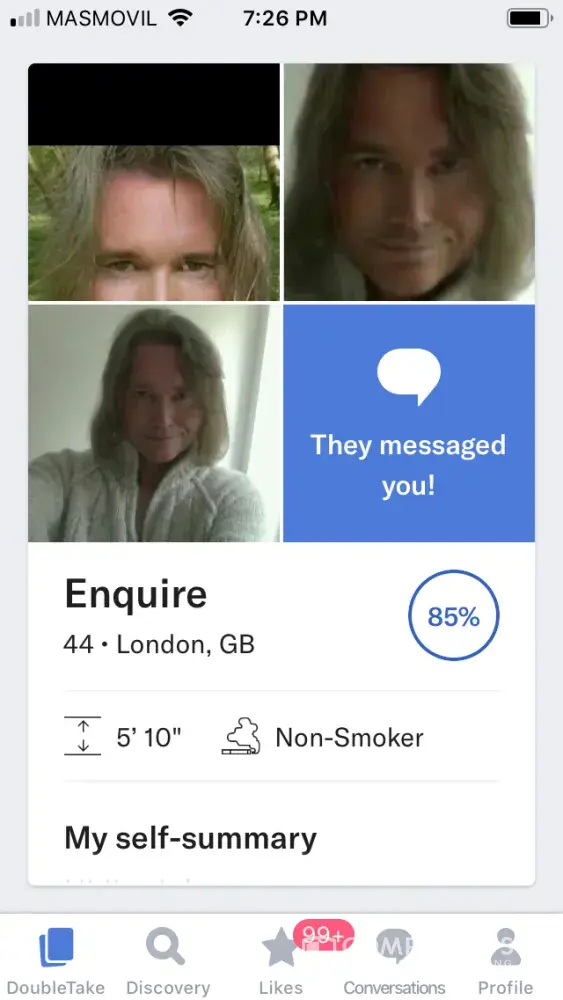 I have a screenshot of his profile, his name Enquirer, 5'10, 44 years, non smoker from London