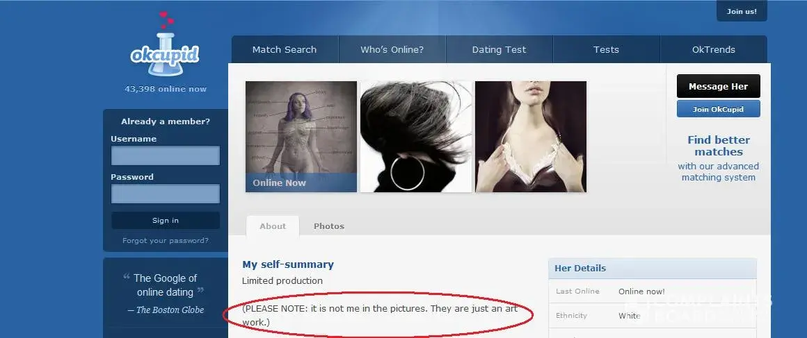 Yes for men it is even worse - for every man with fake profile there are 100 women using pictures NOT of themselves but porn stars and models such as Adrienne Manning, Lia 19 and many others(ofcourse the person actually doing the scamming could be a male posing as female - one has no way of knowing). Ofcourse okcupit is not the only and probably not the biggest offender of this.For example Zoosk, match.com, and Facebook has so many females who put a profile with pic's of porn stars and models claiming them to be pictures of themselves. Now it would be very easy for match and facebook and others to use the automatic picture scanner :http://www.google.com/imghp?hl=en&tab=wi to get a readout which will come up with the celebrity associated with the picture. For example I have heard that the owner/founder of facebook M.Zuckenberg or some like that is worth over 10 million dollars so it is likely the company is worth a million or more and they could very easily implement this type of check along with match.com, Zoosk and others ! Also all these scammer girls always end up asking you for money - i have been taken for a total of about $64, 000 from them.