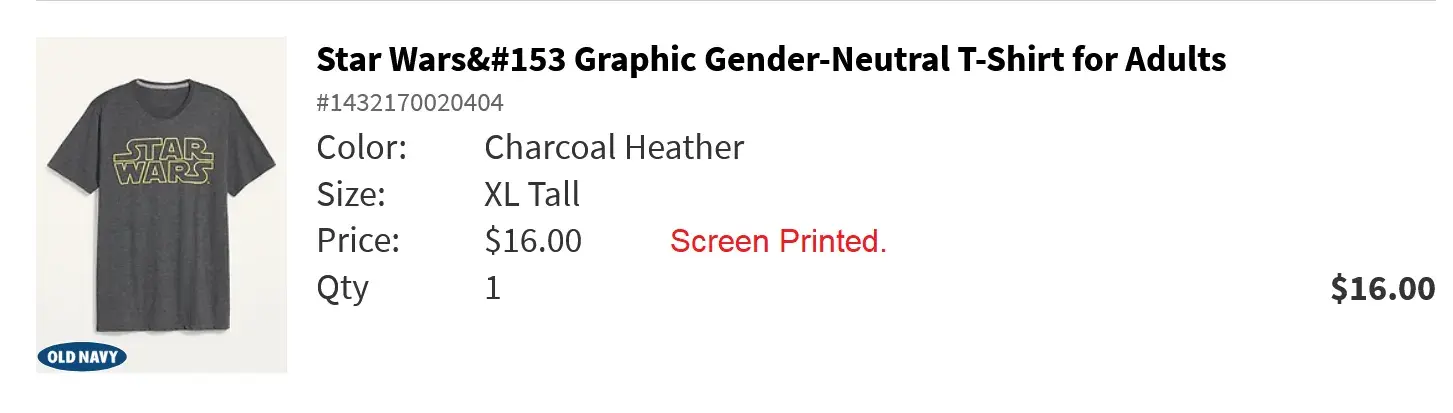 Old Navy produces Screen Printed graphic t-shirts and other apparel, it's literally the only reason I purchase anything from Old Navy, but lately I've been getting nothing but vinyl iron on garbage. There's no mention in the description, no way to review so other's won't buy this trash, and customer service doesn't care that you're scamming customers. Screen printed shirts last YEARS I have several shirts that I still wear to this day purchased from Old Navy that were screen printed, but the shirts I've purchased recently with iron on vinyls last a year(at best) if treated with the absolute utmost care, there needs to be some mention in the description whether it's in product details or materials & care about screen printed or vinyl iron on because if I'd noticed it was a vinyl I never would have purchased any of them.w