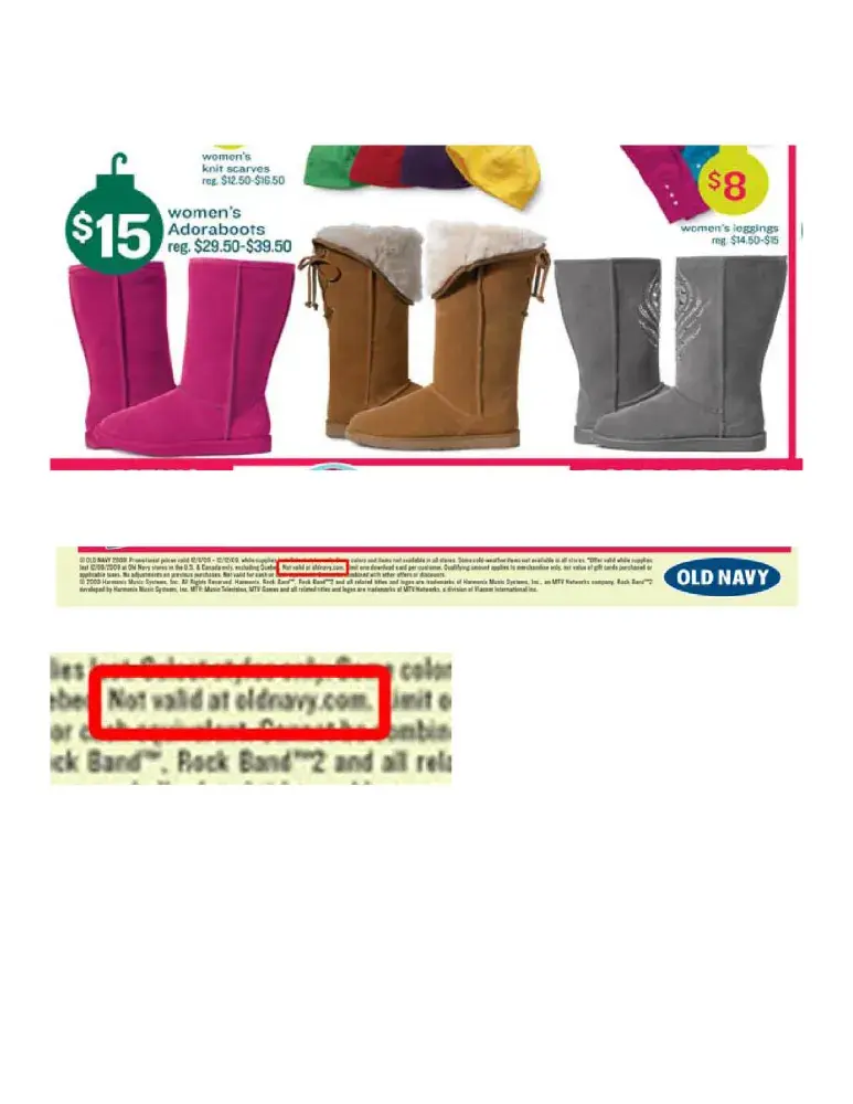 Today's Old Navy circular from the newspaper clearly shows that their ladies "Adoraboots" are $15 on sale this week. However, these same boots are $29.50 if purchased online. After a bunch of searching on the site and in the ad (which I "browsed" online) I found that the sale price is good "in store only." Huh? I've had an online shopping cart filled with more than $300 worth of Christmas gifts for several days, just waiting until Tuesday when I get my cardholder discount upon checkout. Now, I'm wondering what other items I could get cheaper in the store? Or, since the whole idea was to avoid going into the store, if perhaps I should spend my hard-earned dollars elsewhere. In one fell swoop, my confidence in Old Navy as a brand that provides good, honest value for my family's clothing budget has plummeted. Does Old Navy REALLY want to go here and risk losing its customers' confidence and loyalty? Especially in the thick of the holiday shopping season? As far as I'm concerned, inconsistent pricing is SHADY business.