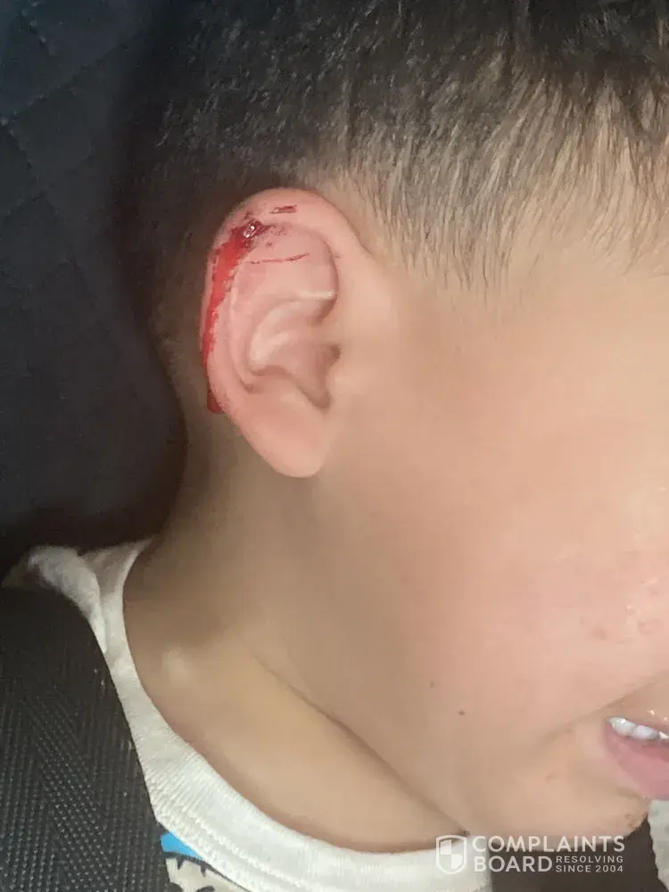 We were in boy clearance isle and he tripped and he sliced his ear .
