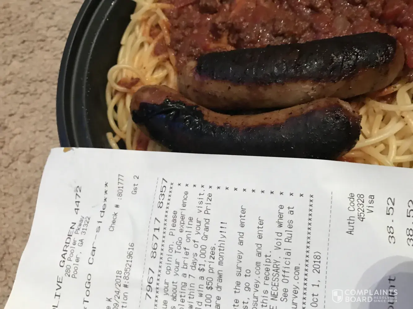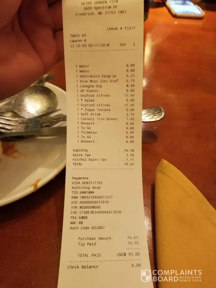 olive garden 1538 our server was very nice. we ordered chxparm sand and bogo.after receiving our food our server never returned until 18 mins later. we have not consumed any food as their was maybe 2 oz. of sauce. she asked if we needed to go containers.we have not had any of our food and it is 24 mins after receiving our meal so now is cold. we asked for a side of sauce since it was clearly dry. upon receiving our bill we were charged 3.49 2x as dipping sauces. when we questioned our server she stated we should have requested EXTRA sauce in the beginning.so she removed the 2 $3.49 with a civil attitude. we left a $10 tip cash our total was 26.26. somehow our card was charged 31.51.upon calling location gm he told me lets see if it fixes itself. IS THIS A JOKE! he then told me sometimes the servers hit the wrong amounts with the wrong cards so lets see what happens give it a day. MYSTERIOUSLY THE 5.25 WENT AWAYso how many times do servers charge the wrong cards.i do our books and their is a 3% mix up. I will never eat at olive garden again. my company purchases at least 5000 . in gift cards from your company in the past 10 years nov dec. for our company. how disappointing. linda [protected]@yahoo.com