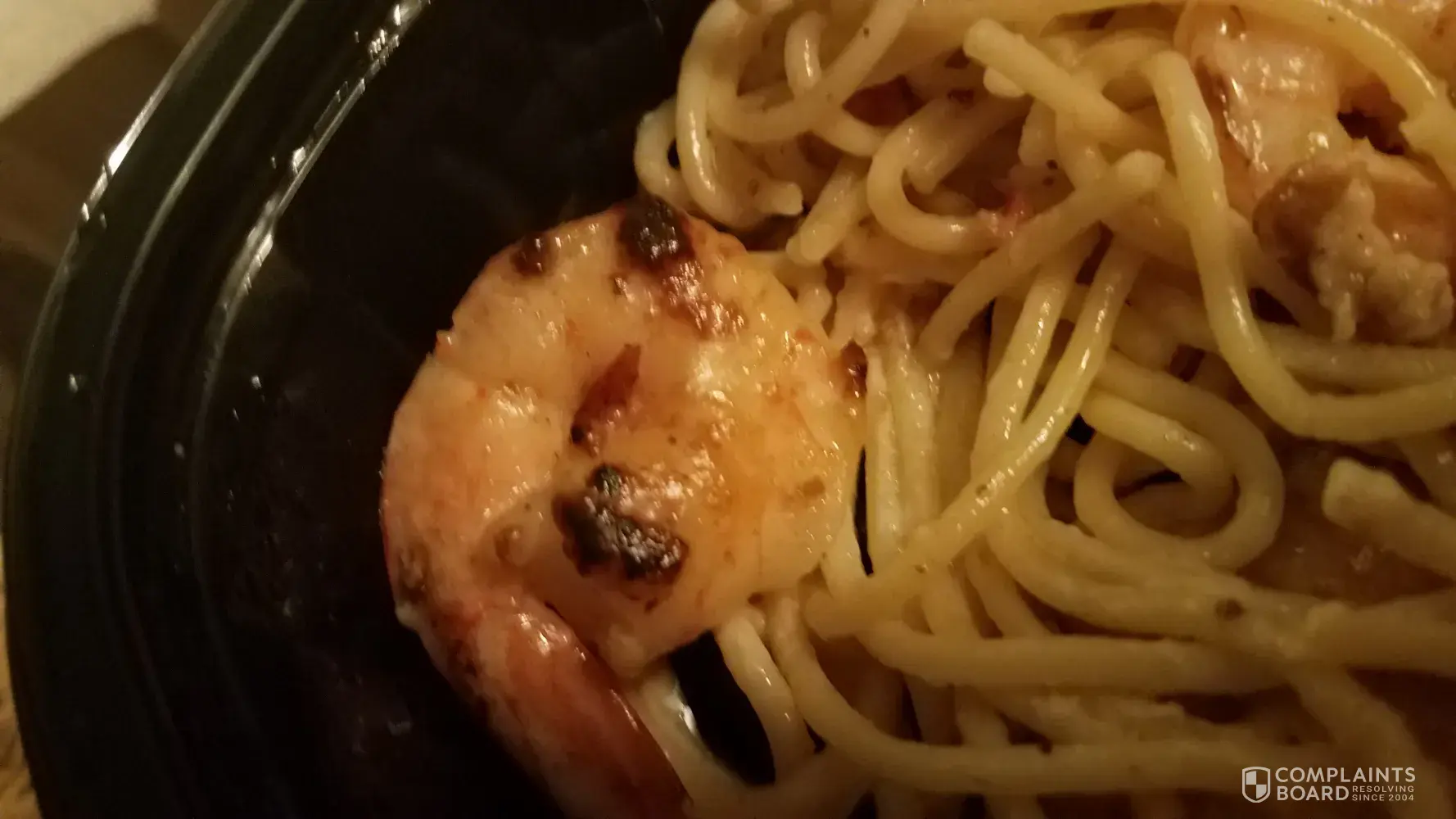 (On 10-21-2017 around 18:00 my husband ordered shrimp and scampi dish when he started to eat he saw that there was something very hard that he could have chocked on it (photo attached) he called the waitress (Amy) and she said that they had other complaints like that so she called the manager (Pam) which told us that they were looking for an other company to buy their shrimps and tried to explain. My husband said that it is dangerous to choke on this but it did not seem to bother her and that she will tell the cook. I think that they should not served a disk like that somebody could choke and die. Please let me know what you are going to do about this. I tried to find the head office phone number but I could not find it.