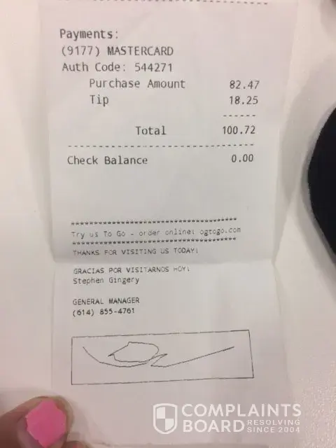 The receipt stated the manager was BEN Shifflett. I remember trying to get his attention at one point but was ignored.