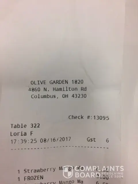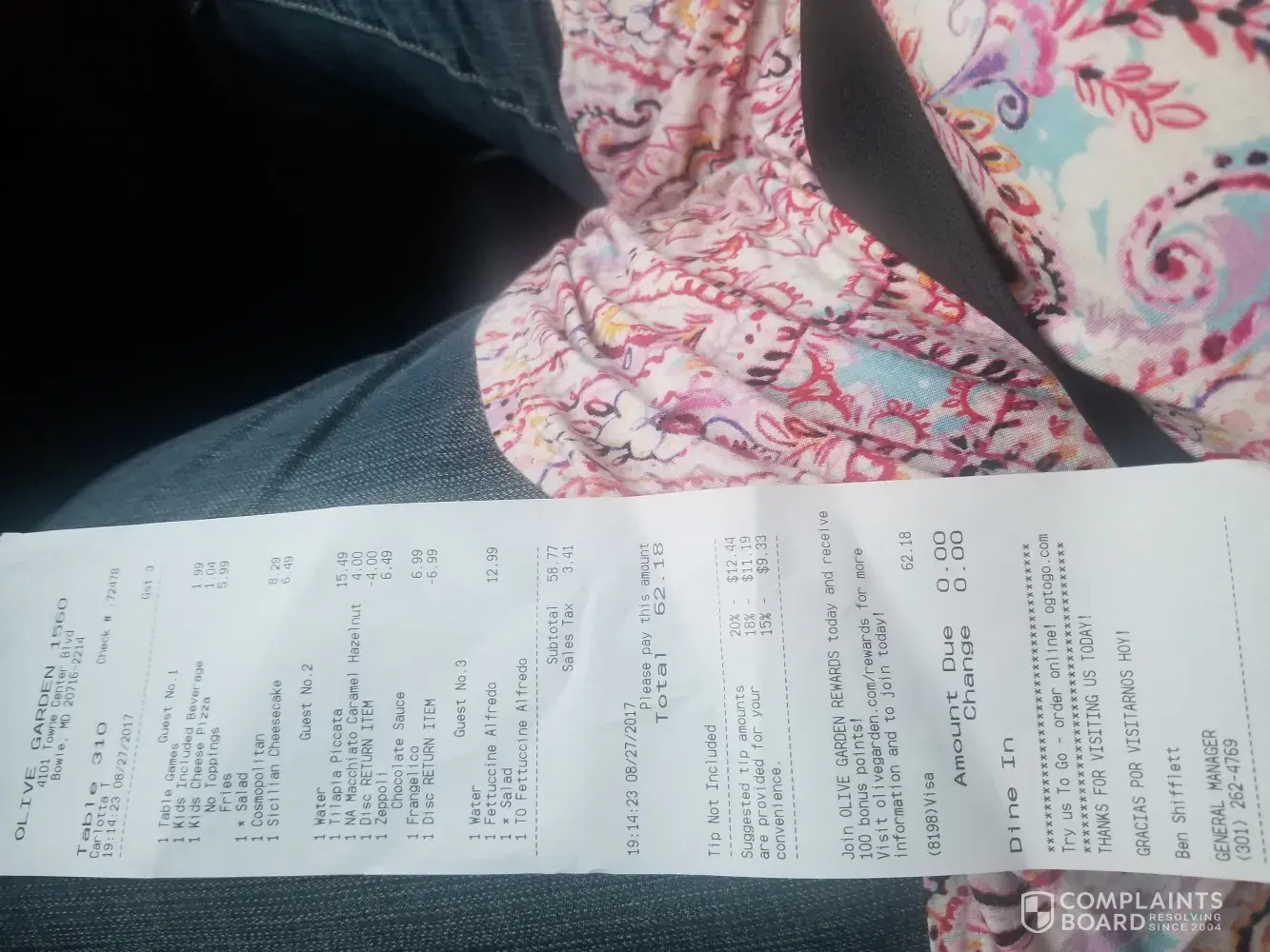 Hi, on August the 9th I was on OLIVE GARDEN [protected] Sand Lake Rd. Orlando, 32809