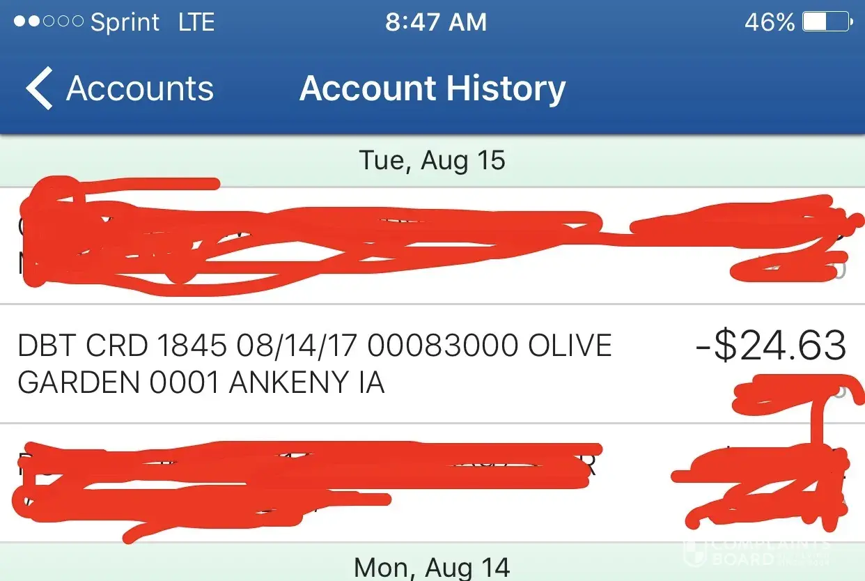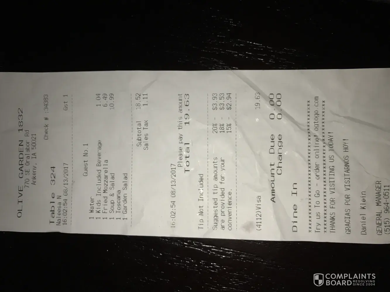I went to Olive Garden with my 4 year old on 8/13. She got fried mozzarella and a water yet i was charged for a kids drink! My bill including the drink that I never received was $19.63. That is the amount that I put on the "total bill" line as I put a $5 cash tip on the table, yet after I left my card SOMEHOW got charged $24.63! I called and talk to a manager two days later (when I noticed the wrong amount on my bank statement) and he said on his end it shows they only charged $19.63 then he said "sometimes banks add a tip just in case, then it drops off when it goes through." I knew that statement was not true as I have been to plenty of places and that has NEVER happened! I also called my bank prior to talking to this manager. I also told him about the charge for the kids drink when she only got water! He said he would send a $5 gift card in the mail. I'm still waiting for that. So I waited two more days and it definitely went through for $24.63. So I called the store back and talked to a different manager and asked what the total was for check # 34383. He said it was $24.63. I told him that really upsets me because I did not sign for that amount and asked where that extra money came from. He said it looks like someone added a $5 tip. I told him I left cash on the table and my card was not charged a tip when I signed! He took my information down and said he was going to look into in and call me back and I still haven't heard from him! The amount has yet to be credited back to my account as well! My waitresses name was Naleesa N. and this happened on Sunday August 13, 2017 at the Ankeny, IA location.