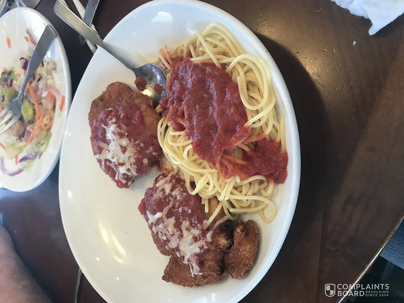 I am absolutely disappointed with the experience I just had. I ordered the peach Bellini and the waiter seemed confused. After taking the order he came back to the table to confirm that I wanted the peach tea. I had to open the menu and point to the drink that I had ordered. He apologized and said he was new. The salad, appetizer and entree were all delivered to the table at the same time. My order was not correct (I was delivered the grilled chicken parm and I had ordered the fried) and when I asked the waiter he said that it comes that way (I know it does not come grilled and may be a new option but I did not order it that way). He was wrong but said he had to ask his manager (it was obvious that he did not know the menu). Then my correct order came out, but it was poorly executed by the kitchen (the plating was not appitizing and there was only a few sprinkles of cheese on top and not how it is advertised or normally comes). I was not offered any parmaseam cheese to top it with, which is why I ordered the chicken parm, because I like the cheese it was supposed to come with. This is the second time in the last two months that I have gone to Olive Garden and left hungry and disappointed. The first time we ordered drinks and waited 15 minutes, the waiter never came back and we did not even have water while we were waiting for our bar drinks. I also had my two small children with me and they are not patient when they know it is expected that they have something to drink.