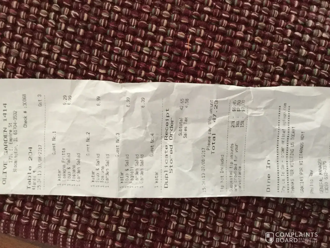 My husband and I visited the olive garden in clifton park, ny today. The waitress was very nice. We ordered our drinks and food. Our server asked us if we would like dipping sauce with our bread sticks, such as marinara or Alfredo. We said sure, both would be nice. Well... She never told us there was a charge of $3.49 for each! We couldn't believe it when we received the check. She had offered it sounding like it was complimentary. We paid and left, didn't say anything. When we went to the parking lot the next table over was talking about the same thing happening to them! So I searched complaints on line and sure enough the same complaint from other people are on line. I truly feel like I had one pulled over on me! So then I decided to call the store to let the management know what happened. Her name was Jessica. She had me on speaker and heard someone laughing in the background. When the girl really started laughing at the end of our conversation she picked the phone up and took me off speaker! That was the management! She offered a gift card, I said I didn't call for any compensation I just do not want the same thing happen to the next family going there. I'm totally disgusted!