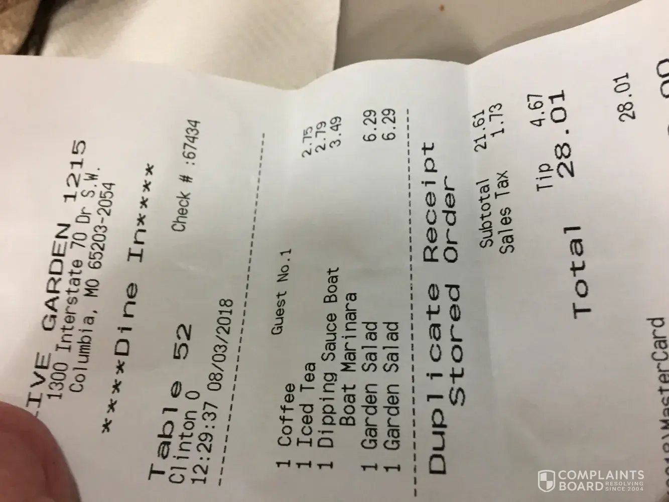 Coffee was extremely cold, took a long time to get hot but it wasn't fresh . Salad was over dressed and tasted like eating straight salad dressing. Manager notified salad replaced still did not have quality I am used to at Olive Garden.Bread sticks cold and dry. We chose not to order more. And left hungry. We did pay full price and left server a tip. It will be a long time till we eat there again. This was Olive Garden in Columbia mo .