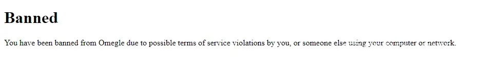 Hi, I went onto the omegle website to look for a normal conversation with someone and for no reason at all I got banned from omegle. I did not get naked or anything, I was just looking for a normal conversation. The site said ( You have been banned from omegle due to possible terms of service violations by you, or someone else using your computer or network ) This happened just earlier on tonight but I did nothing wrong. Can you please unblock me so I can access the omegle website again, help would be appricated.