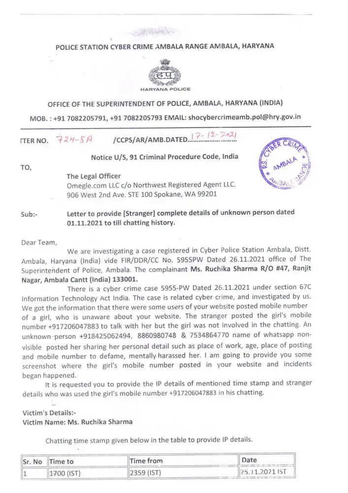 investigating a case registered in cyber police station ambala INDIA CC no 5955 PW dated 26.11.2021 office of the Supdt of Police Ambala the comp Ruchika Sharma.