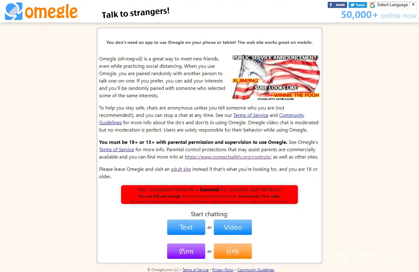 Why is omegle censoring climate behaviour? Boycott this company. This is not how any kind of public company should behave, especially with no public board of commons / complaints / rules to see and review. Why did this chat flag me as "banned"? This is ridiculous.