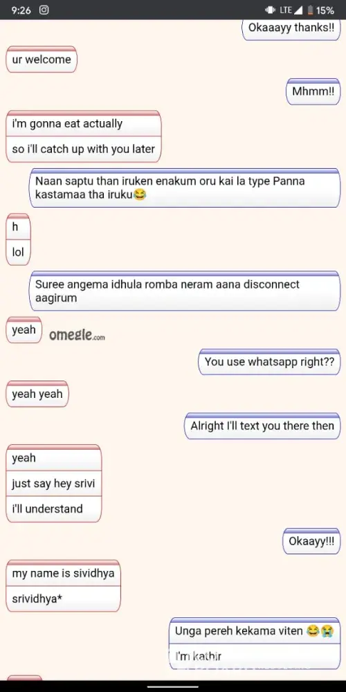 We request you to kindly find the person out using my name (Srividhya) who's faking me and doing stuff at the earliest possible. I've attached a screenshot where one of them who chatted with the fake me .