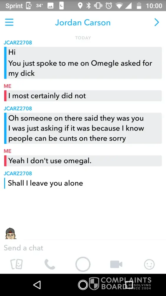 So for the last 3 days dozens of boys have been adding me on Snapchat sending pictures of their penises. Why, you may wonder? Because a chat room called omegle, which I had never heard of, has a "bot" repeating the message "add me on Snapchat I'm so wet" following with my username.