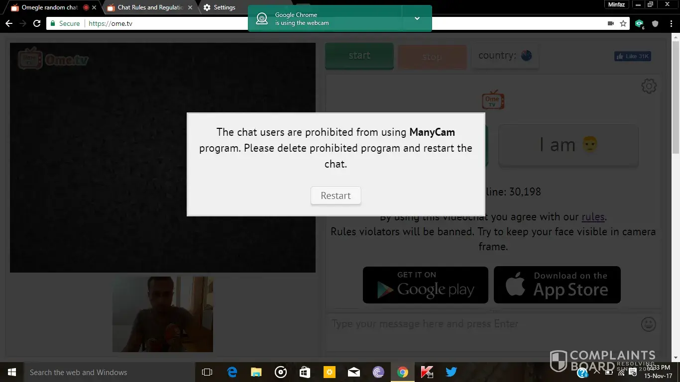 I used Ome.tv on Google Chrome for the first time without knowing its rules when I got banned for exposing nudity. After the ban period was over I tried connecting back into the website, but it showed me an error message saying that I have ManyCam running. I used to have ManyCam in my laptop for my studying purposes long time back. I never misused it. Please fix, I have attached the screenshot along this complaint as proof.