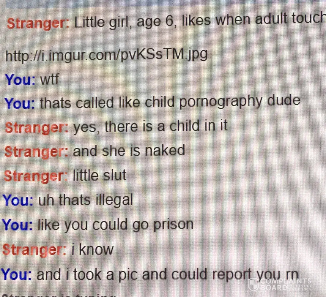 I just had 5 kik messages from 5 random people who I've never met before or never head of telling me that my kik username is being given to strangers and pedos could find out about it saying and I quote what people have been sending the message about "female 13 horny don't say hi just send me a pic of your d*** and I will get my t***and p**** out for you" FIRSTLY IM NOT 13, secondly I don't use omegle or give my name out and thirdly there's some sick people out in this world! I'm not that sort of kid I just enjoy playing football and hanging around with people I KNOW! This site should definitely be removed!