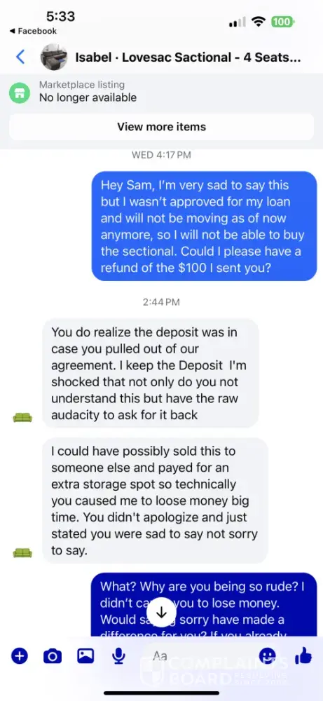 I was scammed out of $100 on Facebook Marketplace. The seller was “Sam Smith†and he requested that I Zelle him a deposit of $100 for a couch I wanted to buy. There was no agreement that the deposit was non-refundable, so the assumption would be that the deposit is refundable. I found red flags all over this person’s account and asked for the money back. The person excessively insulted me and refused to give me the money back. He sent me a screenshot of my own account seemingly in a way to intimidate me that he had my information. This group or person is an absolute scammer!