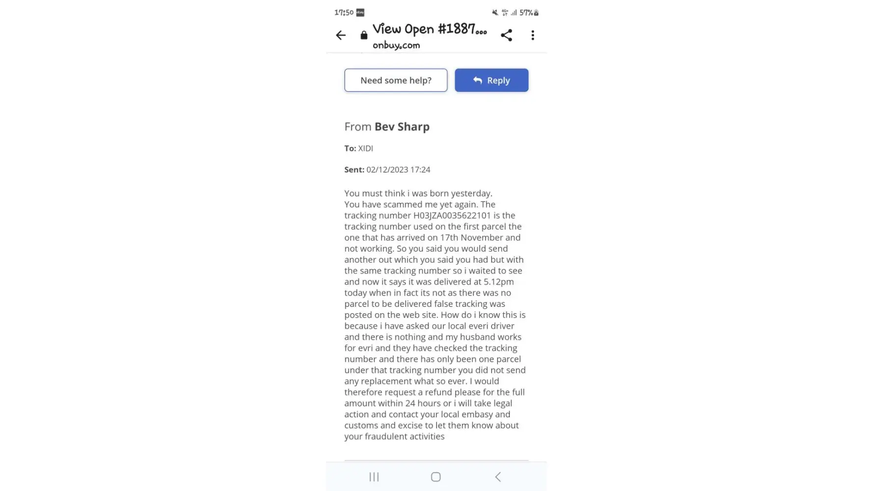 I have been trying to get an item not received from one of their sellers since 26/9/23 the request no 695499 3 times i have asked the customer service person to refund me my money as they are not going to send the item hes allowed them to change the item date to date 2 times on the second time i checked the royal mail tracking number it does not exsist contacted onbuy customer service person again today and hes reply i have tryed to contact the seller but they have not answered well they wont and you will let them change the date again i have not named you because thats unfair but you need to be trained properly on customer care you have had 25 days now but it is like talking to a brick wall all i want is my refund i do have all the emails and checks i have had to do myself as they have failed on customer service