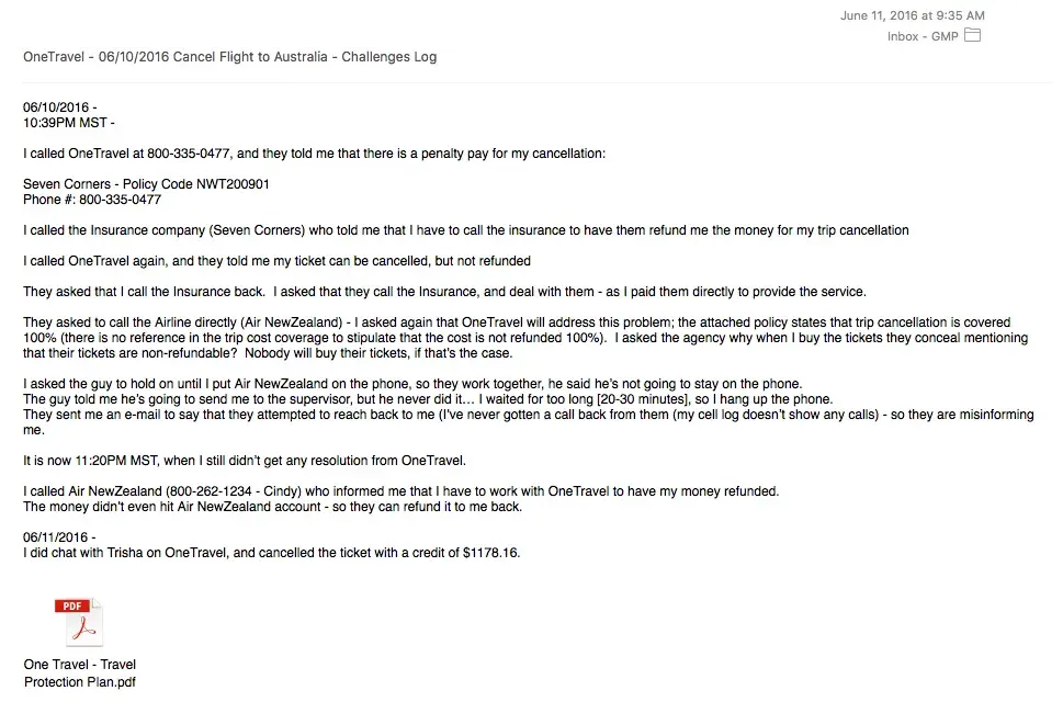 I spent 8-10 hours on the phone, by calling onetravel, onetravel insurance in the us (Seven corners), and air newzealand. Onetravel hung up the phone so many times, but i insisted to get them commit to their service. They didn't. I ended up leaving the credit on my onetravel profile, and using my own money with air newzealand.