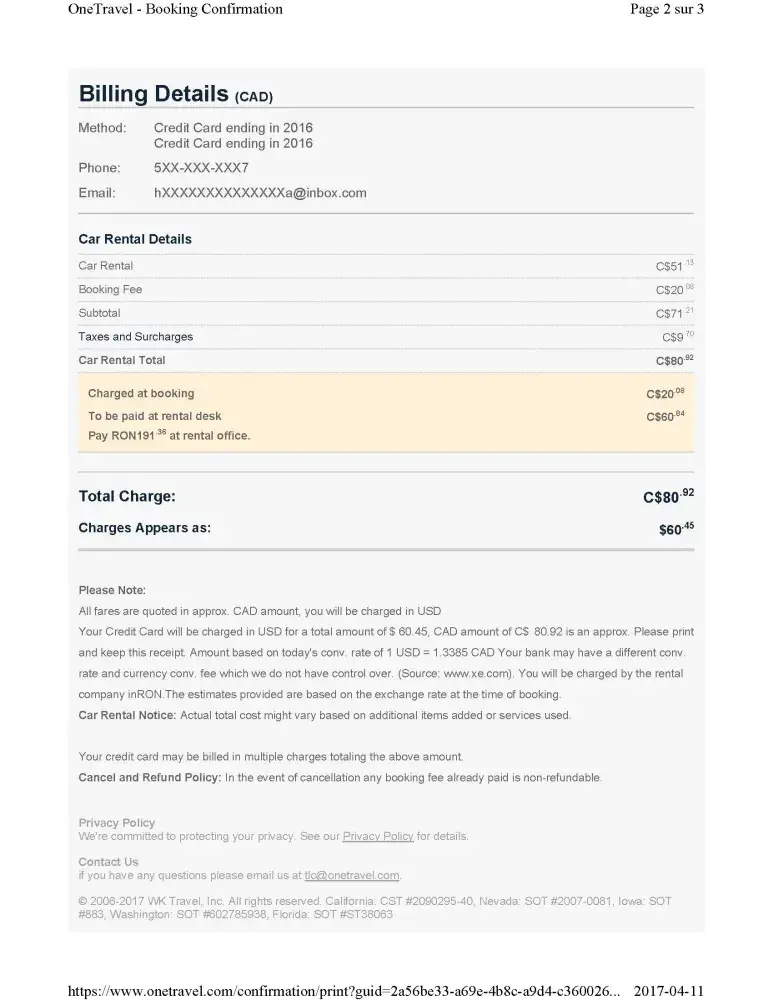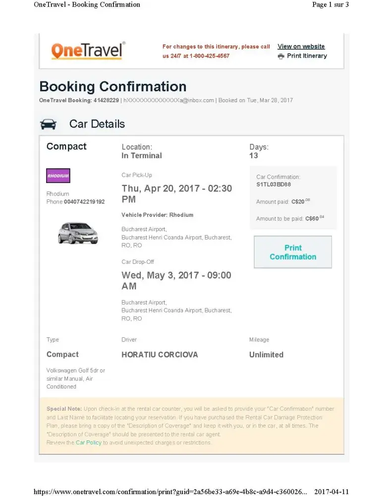 I live in Canada and I have reserved a car with OneTravel from Bucharest Airport.But when I arrived there nobody hear by this rental car company (Rhodium).They have no office and representant there.I had to rent another car from Sixt and I lost my money and my time.OneTravel charged me and they told me they cant refund me even if they sold me a ###.iS