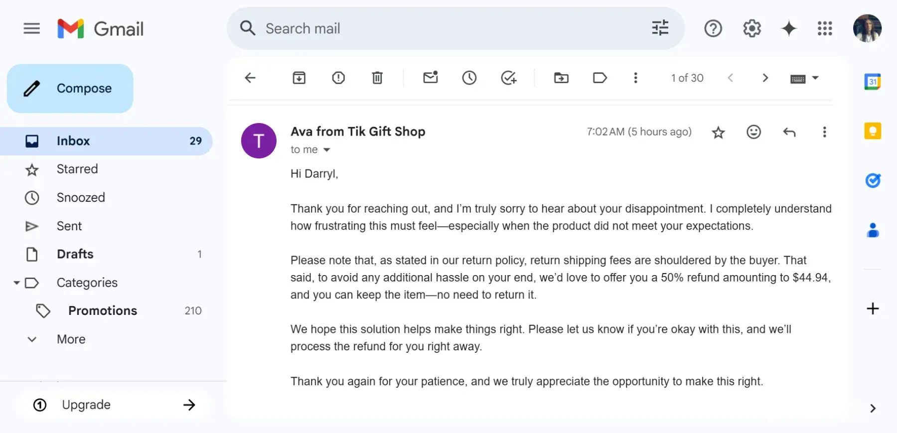 The tik gift shop advertised a drone for sale"Lanus 4k drone 2025" on U-tube for $89.90 to which I made a purchase of for a total of $102.35 (including a tip they requested). Order # TGS7743P on or before May 5th 2025. After an extended period, I received a drone that was not the Lanus 4K drone 2025 that I ordered. I then contacted "support@tikgiftshop.com"...