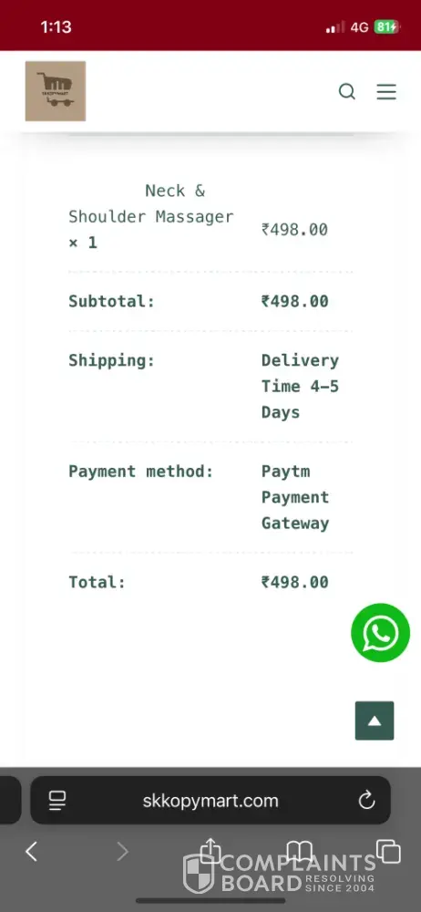 Advertisement popipnon youtube and it shows that some discount is going on. And I ordered one massager and order has been placed and payment done via goay and few days back I checked my Order status it shows as on processing. Soni decided to check the contact number and tried to connect through whatsapp. There I found whats app number is 9876543210 and fake e-mail address.. So I decided to report on all possible areas.