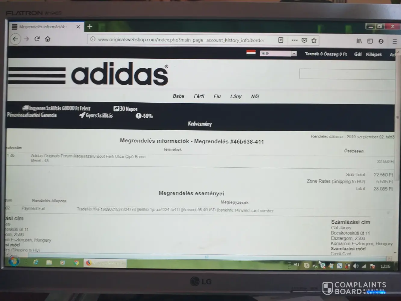 On september 2, 2019, I ordered an adidas originals forum high top brown boot men's street shoes from originals webshop.com and a low quality white plastic shoe was posted. Ther was no contact on the site, no phone or email adress. I attach photos of the site and a photo of the shoe I sent to me. I'd like to get my money or my original adidas shoes