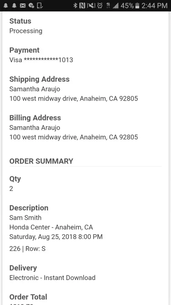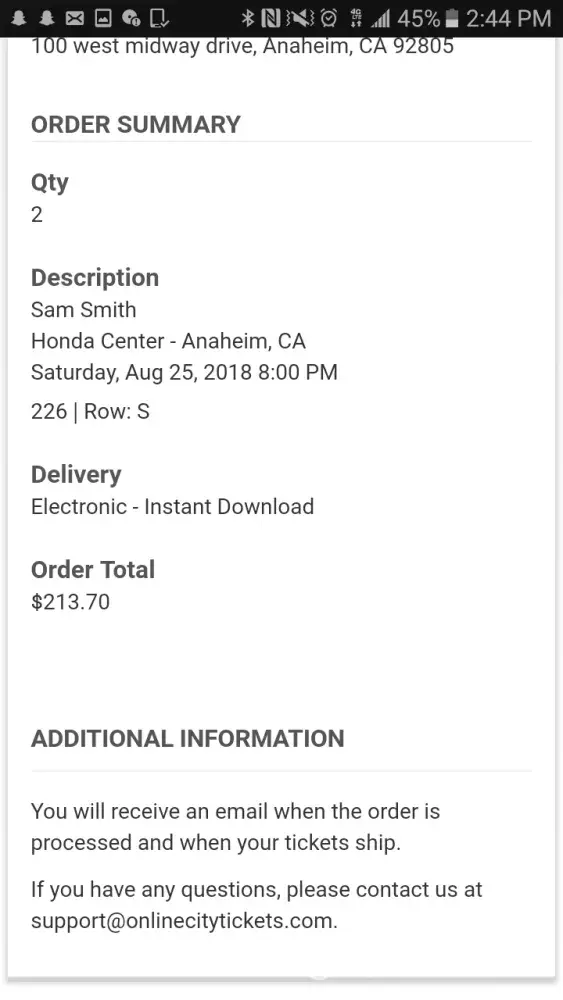 I purchased online 2 tickets for the Sam Smith concert Thursday I believe and yet I still have not received them. I payed for the instant download tickets but haven't received an email confirmation even though my check out said my ordered processed. It's today and I don't want to be worried that my money was wasted and I didn't even get to go to the concert. I don't want to believe that this is a total sham and I was ripped off, or call every minute until it's fix. So please fix this!
