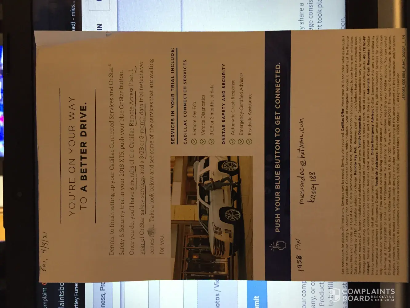 I received a mailing in US mail 4/17/21 offering. (1.) Six months of remote access plan . (2.) One year of Onstar safety services. (3.) 3gb or 3 months of data, whichever comes first. The mailing advised to push the blue button to get connected. This I did and was advised only 3 month offer available. As a Three time new Cadillac owner and a 3 time new GMC owner I feel this mailing was deceptive. Return address on mailing is Cadillac/ connected by ON, P O Box 96214, Washington, DC [protected]. My desirable resolution to this complaint is a new mailing sent to all who received this apologizing for this deception. Dennis Miessen